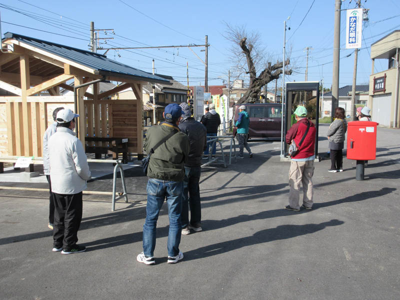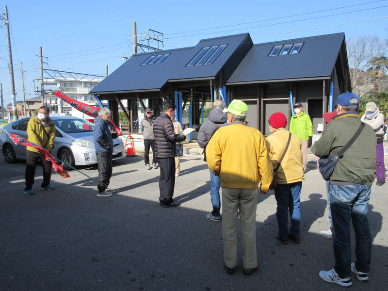 西浦駅で下車し、完成間近の素晴らしい待合所前で、会長の挨拶があり、出発です。この待合所が羨ましいです