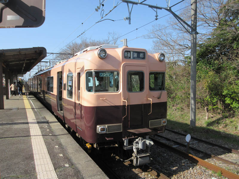 西浦駅に到着です。乗ってきた電車は復刻塗装列車です。これは主に蒲郡線で運行してます。電車はすれ違いのためしばらく