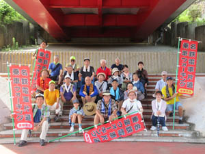 なかよし橋下は日陰で休憩です。休んだ後は参加者全員の記念写真です
