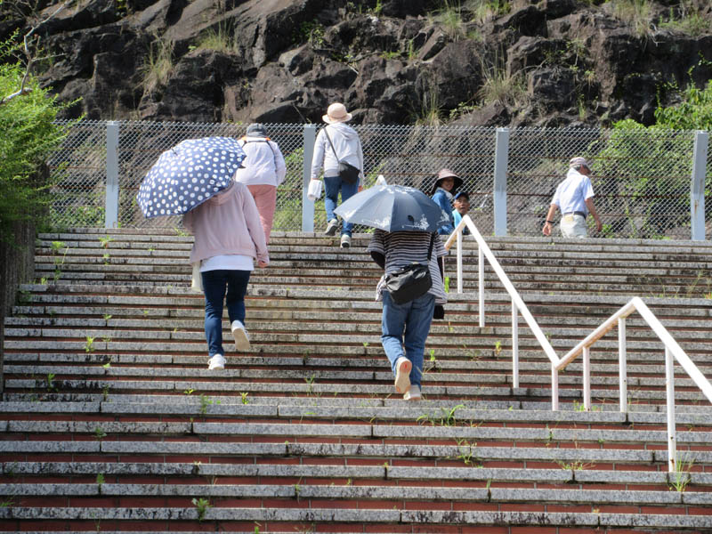 計画では休憩後、みんなで「ゆうひが丘」を1周ウォーキングですたが、あまりにも猛暑で、「ゆうひが丘」は自由となりまして、ここで解散となりました。「ゆうひが丘周遊」チームは階段を上がり出発です