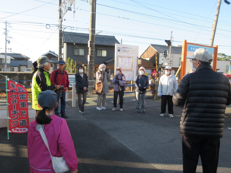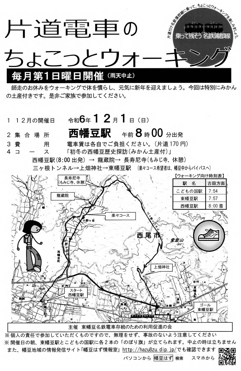 | R6.12.1(日)の様子です。暖冬とはいえ12月です。朝は冷えました。役員さんのおかげで「みかんの土産付き」です。20人が参加し半数以上が山越えのコースで頑張りました。みんないい汗をかいての半日でした。筆者は幡豆中学校で行われている「鉄研」のイベントが気になり見学したく、楽々コースで帰りましたので、山越えの写真はありません。 なお、4年前のビデオですが、「東幡豆名鉄電車存続のための利用促進の会」の応援メッセージは、まだ次のYouTubeに公開されています。全部を見てもらいたいですが、私たちの部分は「応援メッセージ1」の中にあり、1分間位だけど是非ご覧ください。名鉄西尾・蒲郡線利用促進を応援しましょう!! https://www.youtube.com/watch?v=6Pi0hyQLyCY&feature=youtu.be |
