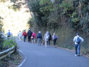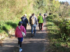 ![]() 小野ヶ谷川岸の竹藪沿いを歩きます。1月開催であった頃は道路沿いの水仙がきれいに咲いていますが、今日はまだ蕾です |