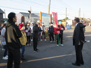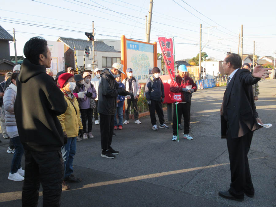 ![]() 会長は出発式の後、幡豆中学校での鉄研イベント出席のため、背広姿で挨拶です |