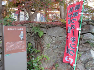 ![]() 長寿庵寺庭園の入り口で「幡豆の民話」の案内看板が寂しく立っていました。 |