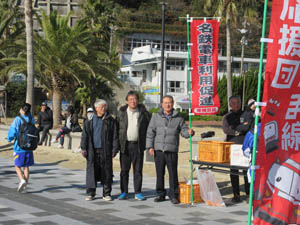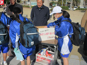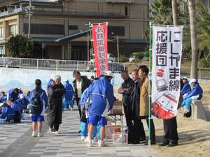 毎月「片道電車のちょこっとウォーキング」を開催している東幡豆名鉄電車存続のための利用促進の会では、今回初めてですが、シーサイドウォークの中継地点で応援会を行いました。当会としては、休憩場所で生徒の到着に合わせて「みかん」をくばりました。