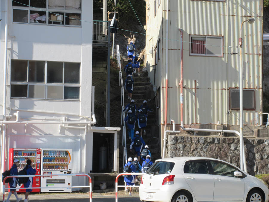 生徒は幡豆中学校を目指し各クラス順番に再スタートします。これで最後のチームです
