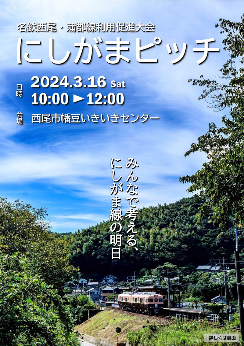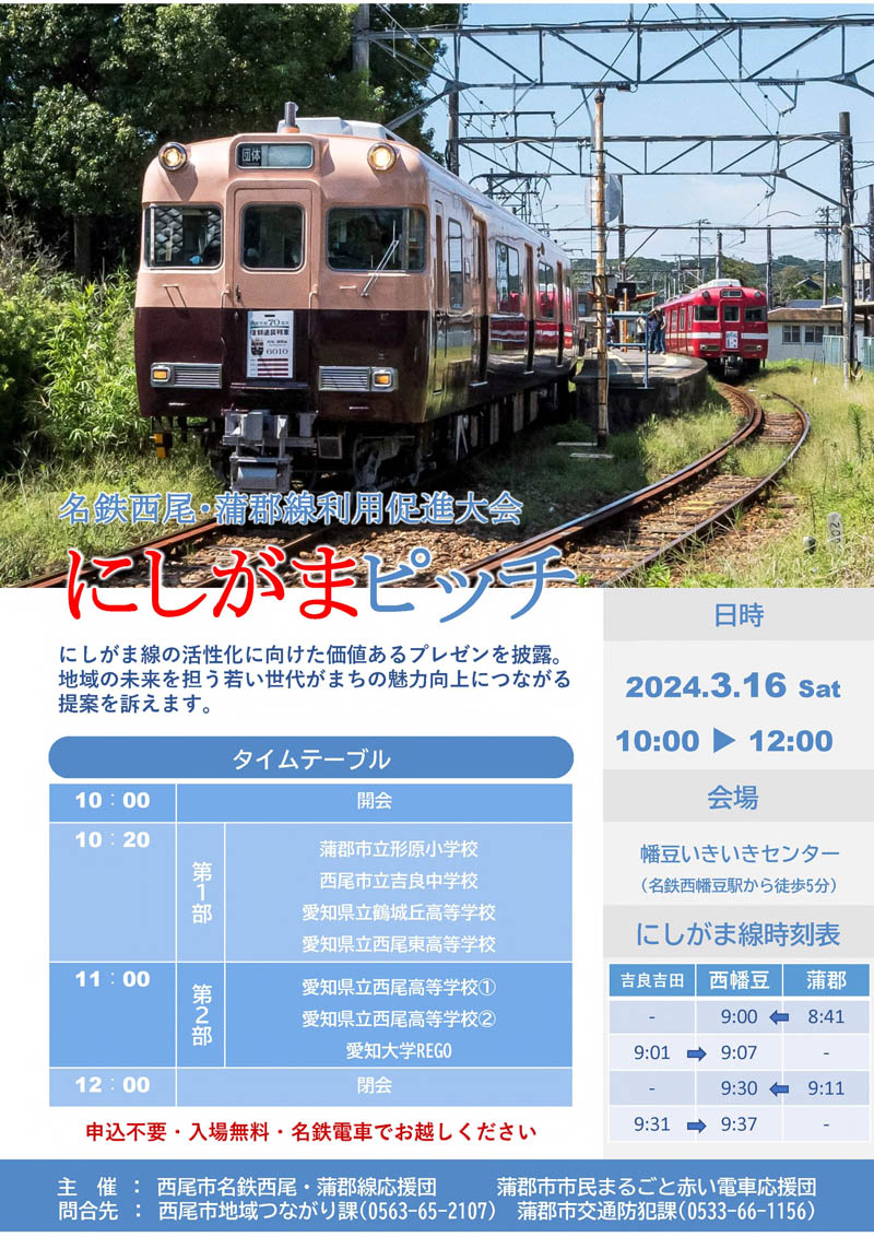 | 名鉄西尾蒲郡線利用促進大会 3月16日(土)、幡豆いきいきセンターに集まろう!! |