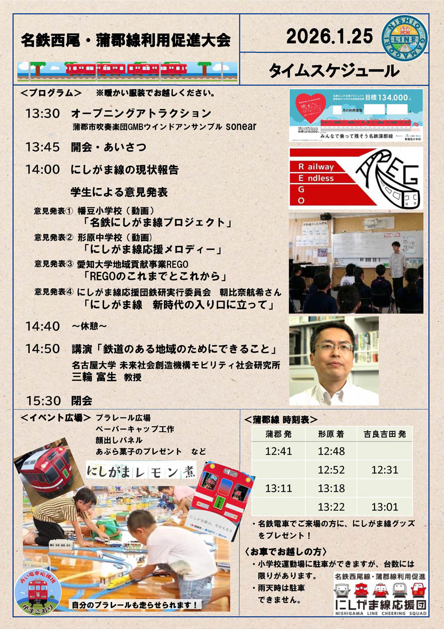 | 名鉄西尾蒲郡線利用促進大会 1月25日(日)、形原小学校に集まろう!! |