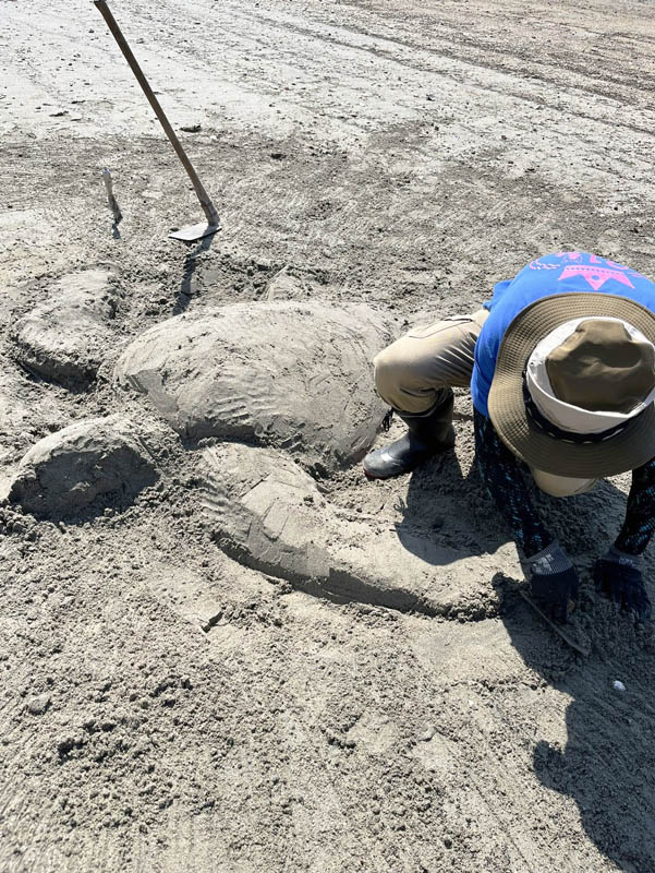 暑い中、砂でウミガメを頑張って造っているM.Yさん (O.Hさん撮影) |