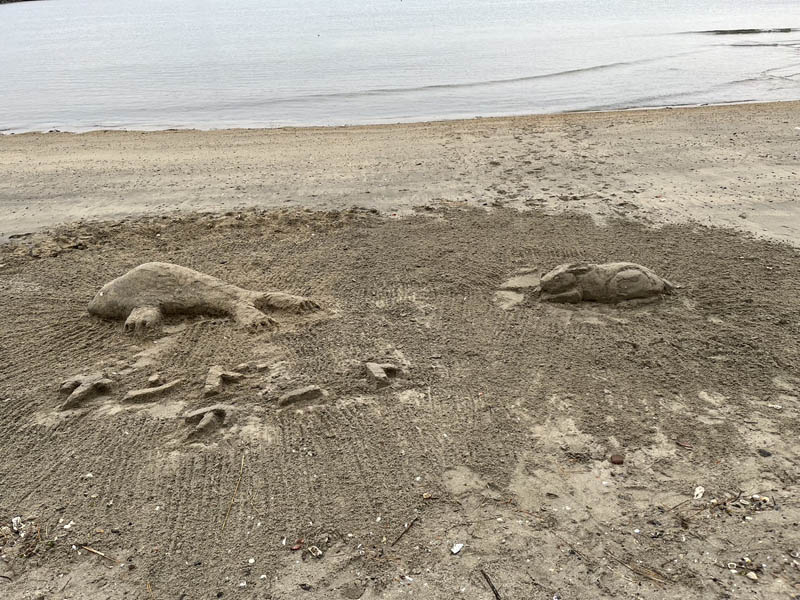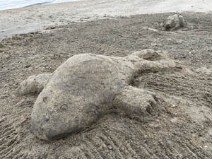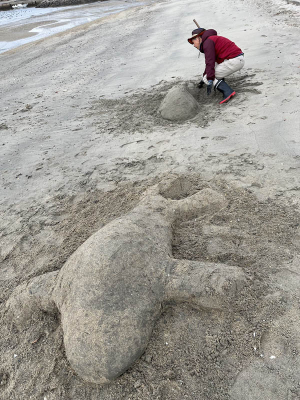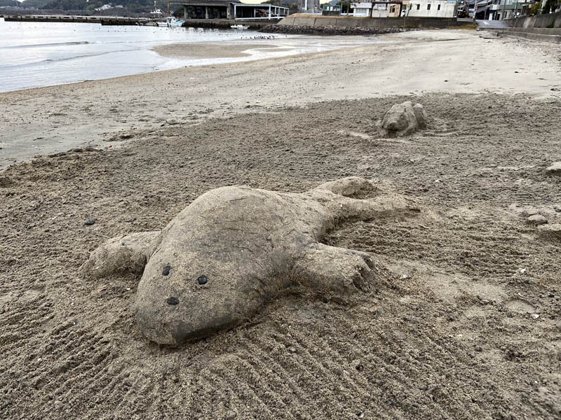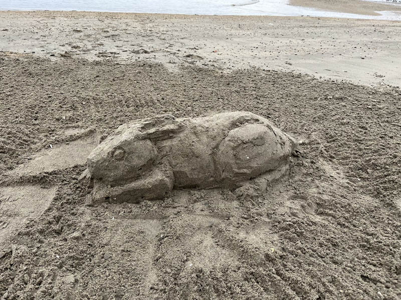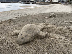 12月16日第3回目のサンドアート(砂像)造りを前回同様MYさんと私OHと2人で妙善寺前の砂浜で行いました。今回はMYさんがうさぎを私がゴマちゃんに挑戦しました。作成中妙善寺にバスで来た子供たちに声をかけられ嬉しくなりました。次回は年末にやろうということになりました。どなたでも参加見学歓迎ですのでぜひ声をかけてください。