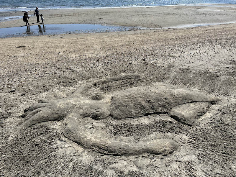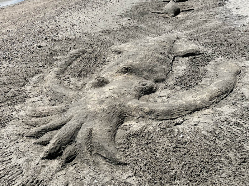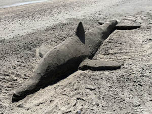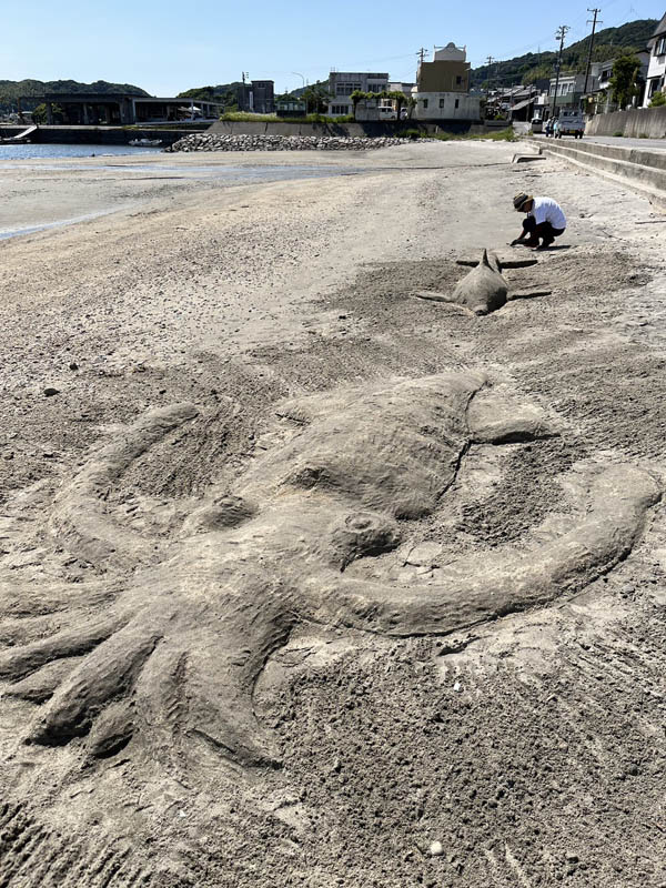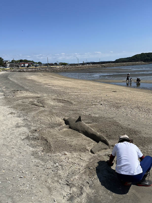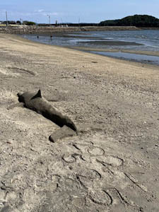 5月25日(土)いつもの幡豆町妙善寺前海岸において第5回目のサンドアート(砂像)制作をMYさんと筆者のOHとで行いました。今回はMYさんはイルカを筆者はイカを作成しました。イルカの背ビレが垂直に立って上手にできました。
